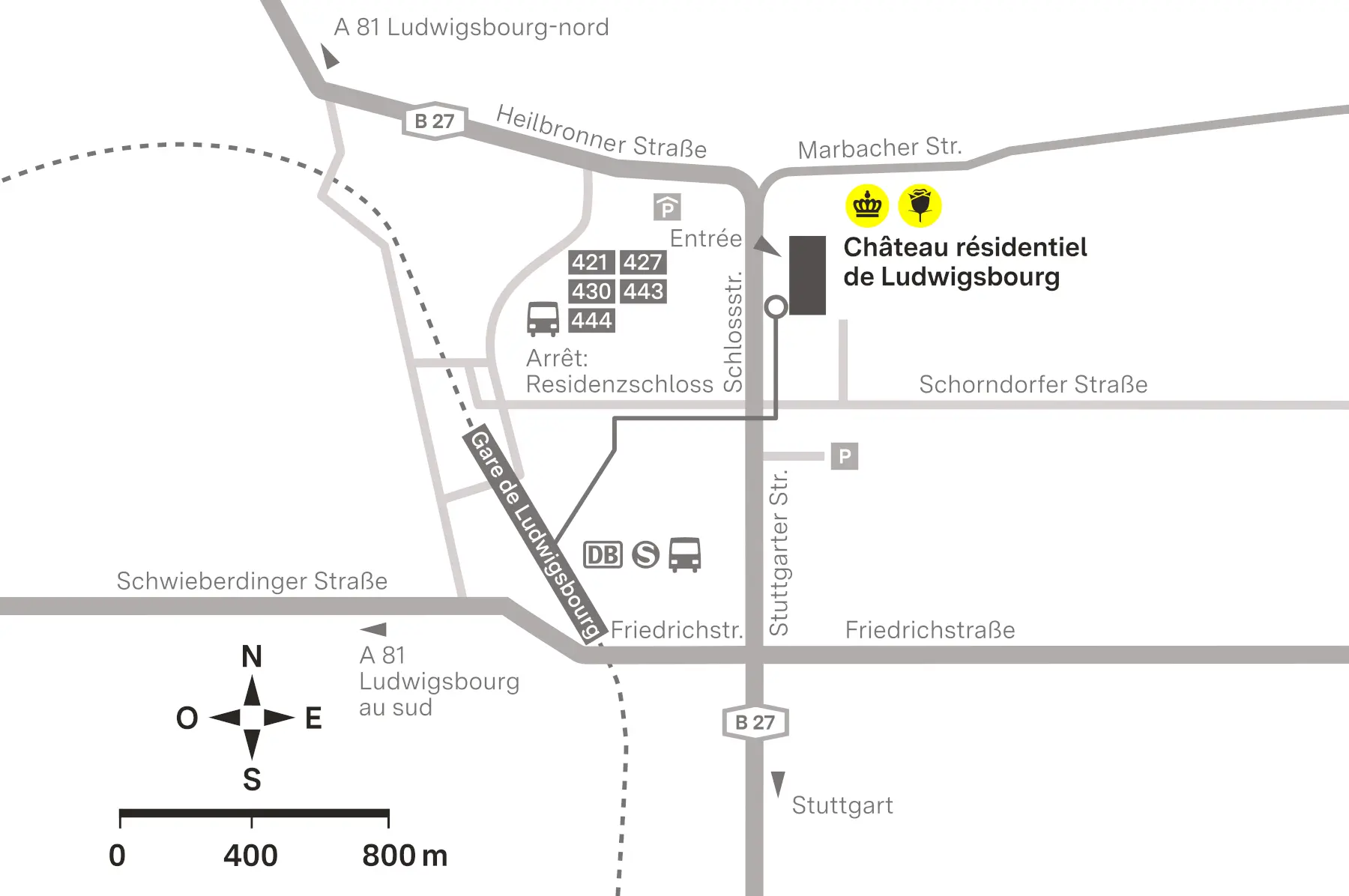 Transports en commun : depuis la gare routière, lignes 421, 427, 430, 443 ou 444 jusqu’à l’arrêt Residenzschloss.